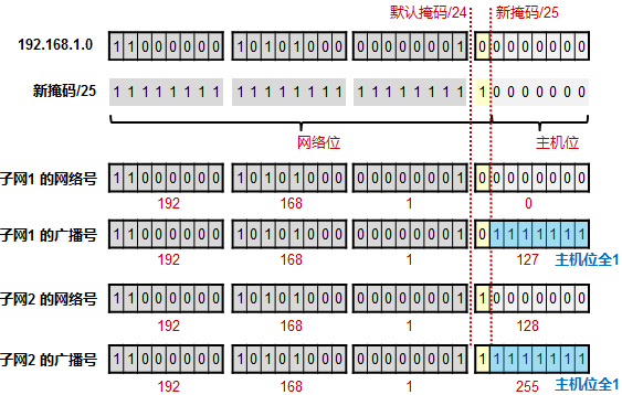 这就创造了两个子网(2的1次方),子网位为0时,得到的网络号是192.168.1.0/25,子网位为1时,得到另一个子网的网络号192.168.1.128/25。