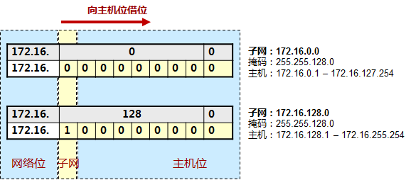 于是从原来的只有172.16.0.0/16的一个大网段,变成现在拥有172.16.0.0/17及172.16..128.0/17这两个小一点的网段。