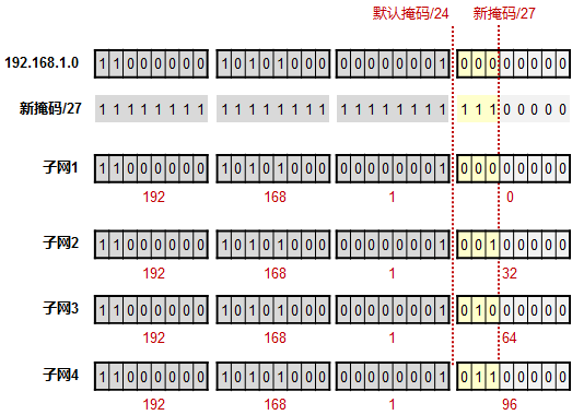 默认掩码/24,新掩码/27因此网络位向主机位借了3位,产生了8个子网,每个子网可用IP地址为30;