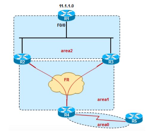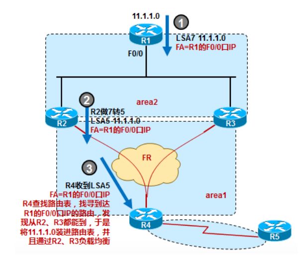为什么R4去往11.1.1.0会出现负载均衡,正是因为虽然R2执行了7转5的动作,这条外部路由的5类LSA由R2产生,但是关键是这条LSA中包含的FA,为非空,那么R2收到的时候,去往11.1.1.0就不是往ASBR(这时候是R2)去了,而是奔着FA去,FA是R1的FA0/0口的地址,怎么去?