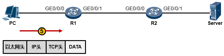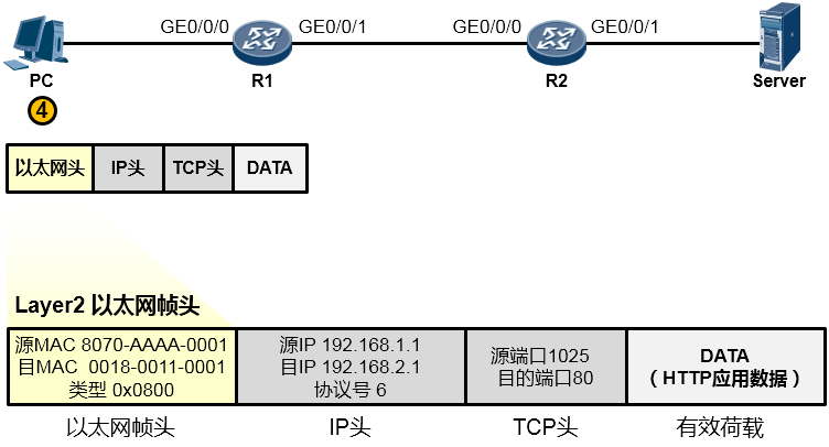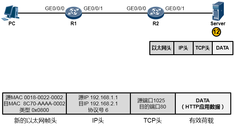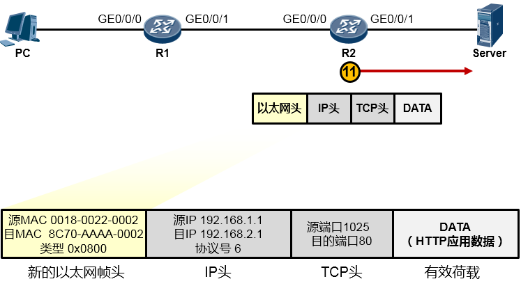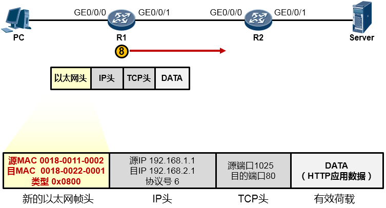 接下来又是重新封装成帧,R2为这个IP包封装上一个新的数据帧头部。