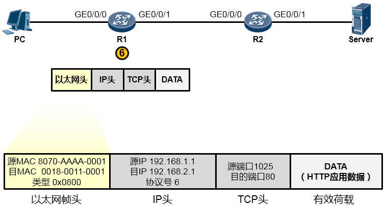 于是它将这个值填写在目的MAC字段中。完成新的数据帧头的封装后,R1把这个数据帧变成1010101通过电气信号传递给R2。