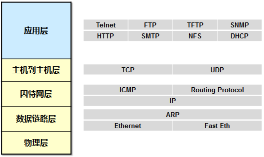 (也被称为DoD模型,上图我贴出的并不是标准的TCP/IP模型,为了方便下文的阐述,这里给出的是一个TCP/IP模型与OSI模型的对等模型。)