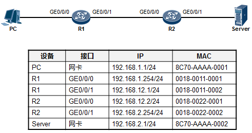 帧头中,源MAC为R2的GE0/0/1口的MAC,目的MAC为192.168.2.1这个IP地址对应的MAC。