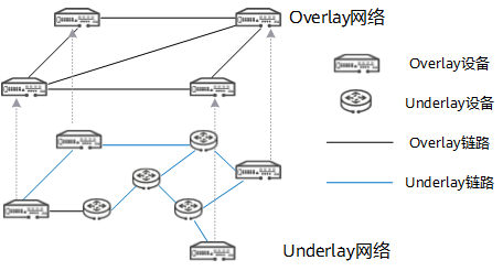 如下图所示,Underlay网络可以是由多个类型设备互联而成的物理网络,负责网络之间的数据包传输。