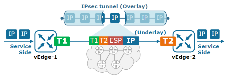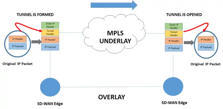 相互连接的SD-WAN边缘设备之间建立隧道,数据包准备传输出去时,设备为数据包添加新的IP头部和隧道头部,