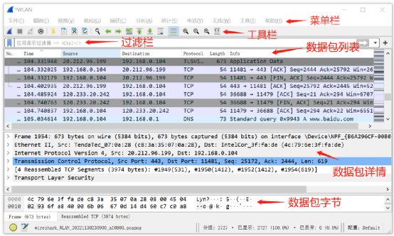 关于wireshark显示过滤条件、抓包过滤条件、以及如何查看数据包中的详细内容在后面介绍。