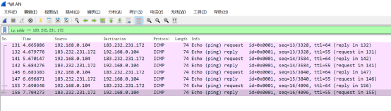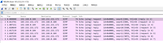 说明:ip.addr == 183.232.231.172 and icmp 表示只显示ICPM协议且主机IP为183.232.231.172的数据包。说明:协议名称icmp要小写。