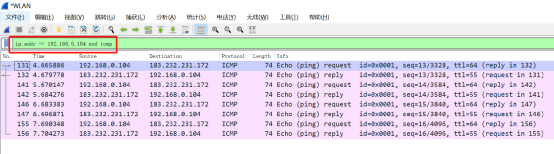 比如获取IP地址为192.168.0.104的ICMP数据包表达式为ip.addr == 192.168.0.104 and icmp