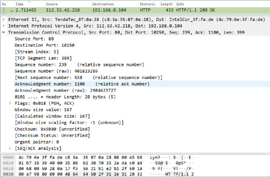 TCP包的具体内容:从下图可以看到wireshark捕获到的TCP包中的每个字段。