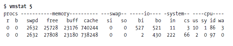 vmstat interval times 即每隔 interval 秒采样一次,共采样 times 次,如果省略 times,则一直采集数据,直到用户手动停止为止。简单举个例子: