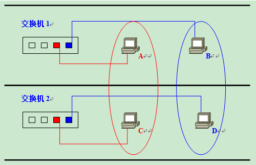 在一台交换机上生成红、蓝两个VLAN,也可以看作是将一台交换机换做一红一蓝两台虚拟的交换机。