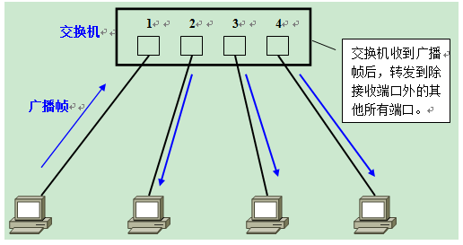 首先,在一台未设置任何VLAN的二层交换机上,任何广播帧都会被转发给除接收端口外的所有其他端口(Flooding)。例如,计算机A发送广播信息后,会被转发给端口2、3、4。