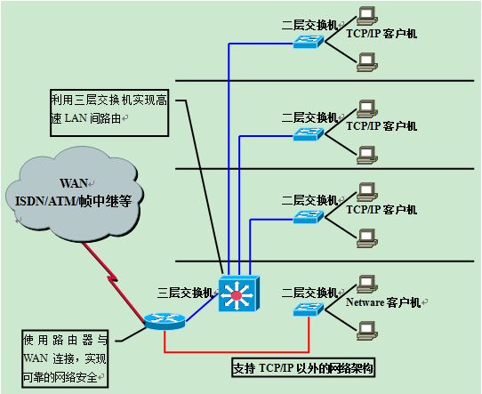 注:在少数高端交换机上,也能支持上述路由器的功能。例如Cisco的Catalyst 6500系列,就可以选择与WAN连接的接口模块;还有可选的基于IPSec实现VPN的模块;并且也能支持TCP/IP以外的其他网络协议。