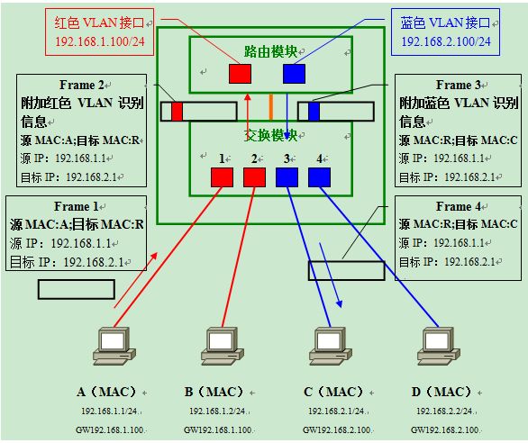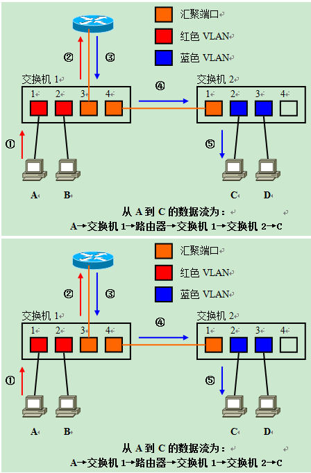 交换机与交换机、交换机与路由器之间均为汇聚链路;并且假设192.168.1.0/24对应红色VLAN、192.168.2.0/24对应蓝色VLAN。