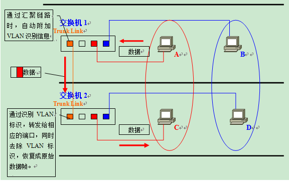 再从A发出广播帧的话,交换机就只会把它转发给同属于一个VLAN的其他端口——也就是同属于红色VLAN的端口2,不会再转发给属于蓝色VLAN的端口。
