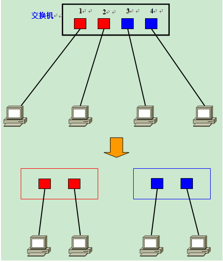 这时,如果在交换机上生成红、蓝两个VLAN;同时设置端口1、2属于红色VLAN、端口3、4属于蓝色VLAN。
