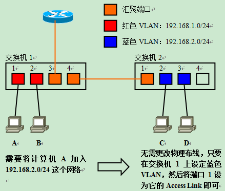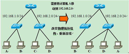 现在如果想将192.168.1.0/24这个网络上的计算机A转移到192.168.2.0/24上去,就需要改变物理连接、将A接到右侧的交换机上。