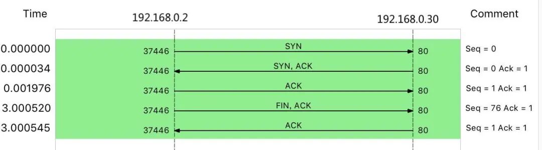 14:40:00.589235 IP 10.255.255.5.39058 > 172.17.0.2.80: Flags [S], seq 332257715, win 29200, options [mss 1418,sackOK,TS val 486800541 ecr 0,nop,wscale 7], length 014:40:00.589277 IP 172.17.0.2.80 > 10.255.255.5.39058: Flags [S.], seq 1630206251, ack 332257716, win 4880, options [mss 256,sackOK,TS val 2509376001 ecr 486800541,nop,wscale 7], length 014:40:00.589894 IP 10.255.255.5.39058 > 172.17.0.2.80: Flags [.], ack 1, win 229, options [nop,nop,TS val 486800541 ecr 2509376001], length 014:40:03.589352 IP 10.255.255.5.39058 > 172.17.0.2.80: Flags [F.], seq 76, ack 1, win 229, options [nop,nop,TS val 486803541 ecr 2509376001], length 014:40:03.589417 IP 172.17.0.2.80 > 10.255.255.5.39058: Flags [.], ack 1, win 40, options [nop,nop,TS val 2509379001 ecr 486800541,nop,nop,sack 1 {76:77}], length 0