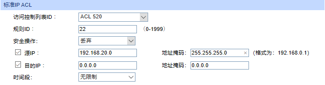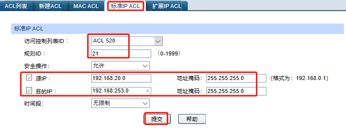 在“访问控制->ACL配置->标准IP ACL”中,下拉选择创建的ACL 520,输入规则ID 21,安全操作选择允许,源IP为研发部IP,目的IP为服务器IP。如下图所示,完成后点击提交。