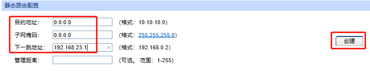 在“路由功能->静态路由->IPv4静态路由”中,设置相应参数如下图所示,注意下一跳为路由器地址,本例为192.168.23.1。