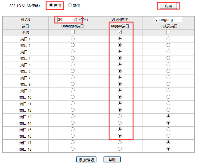 在输入框中输入30,选择对应的端口,选为Tagged,完成后点击添加。
