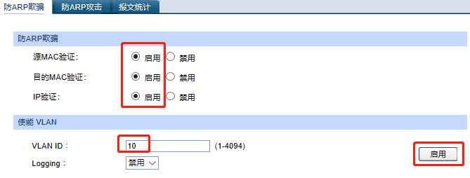在“网络安全->ARP防护->防ARP欺骗”中,选择启用源MAC、目的MAC和IP验证,填入作用的VLAN ID号,点击启用。如下如所示: