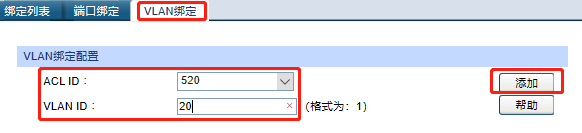 在“访问控制->ACL绑定配置->VLAN绑定”中,下拉选择ACL 520,输入VLAN ID号20,点击添加。如下图所示: