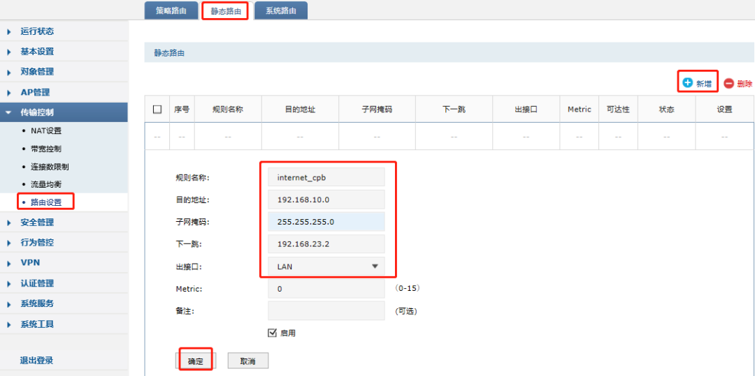 在“传输控制->路由设置->静态路由”中,点击新增,输入相应参数如下图,点击确定。注意此处的下一跳地址为三层网管交换机地址,本例为192.168.23.2。