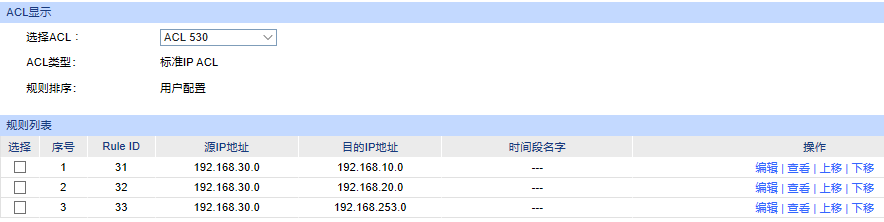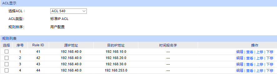 在交换机中主要通过ACL来控制访问权限,本例使用其中的标准IP ACL进行配置,其余的MAC ACL等原理类似。
