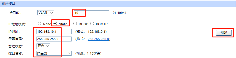 在“路由功能->接口”中,输入VLAN ID号,IP地址模式选择Static,输入网络参数如下图所示,点击创建。