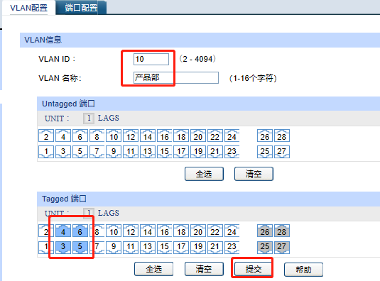 在“VLAN->802.1Q VLAN->VLAN配置”中,创建VLAN10,Tagged端口列表中选择对应的3-6号端口,点击提交。