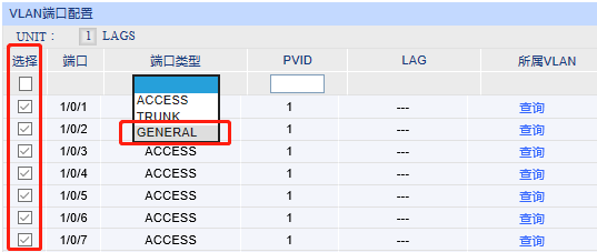 根据规划表格,在“VLAN->802.1Q VLAN->端口配置”中,选中1-18口,端口类型下拉选择GENERAL,点击提交。
