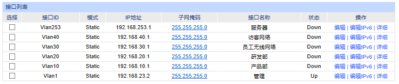 其余VLAN重复步骤即可,完成后接口列表如下: