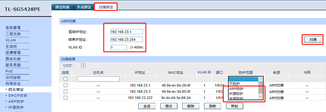 防护功能需要先进行四元绑定。在“网络安全->四元绑定”中有手动绑定和扫描绑定,手动绑定输入相应参数即可,扫描绑定设置如下图所示。