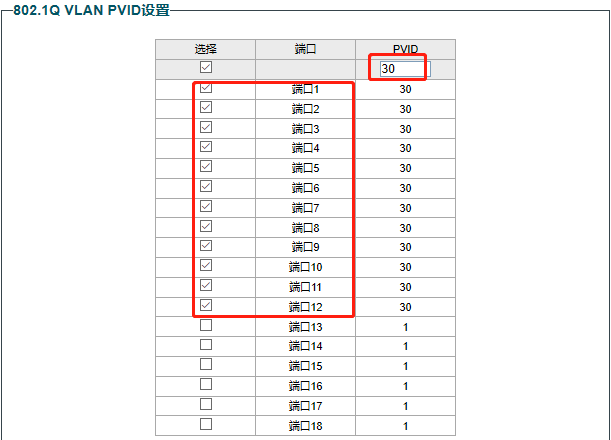 在“VLAN->802.1Q VLAN PVID设置”中,选中VLAN30中Untagged的端口,PVID框输入30,点击应用进行保存。