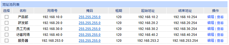 其余VLAN重复步骤即可,完成后DHCP地址池列表如下: