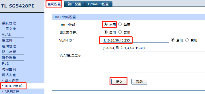 在“网络安全->DHCP侦听->全局配置”中,启用DHCP侦听,输入作用的VLAN ID,点击提交,如下图所示: