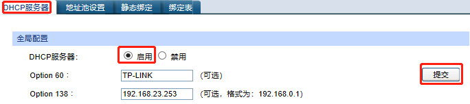 在“路由功能->DHCP服务器->DHCP服务器”中,启用DHCP服务。注意因为需要AC管理AP,所以DHCP服务器中需要填写option字段,如下option 60填写“TP-LINK”,option 138填写AC的IP地址,本例为192.168.23.253。