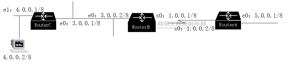 检查RouterB的路由表,配置到4.0.0.0网络的静态路由为:ip route 4.0.0.0 255.0.0.0 1.0.0.2――下一跳配置的是1.0.0.2,而不是3.0.0.1。