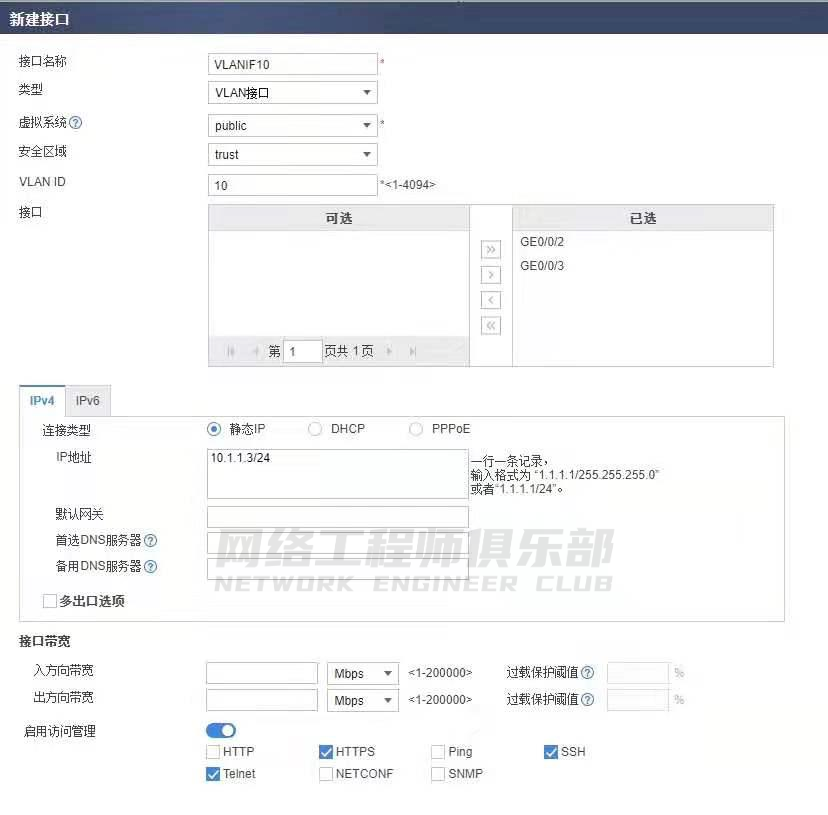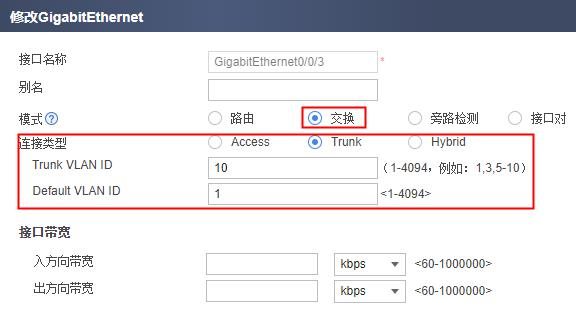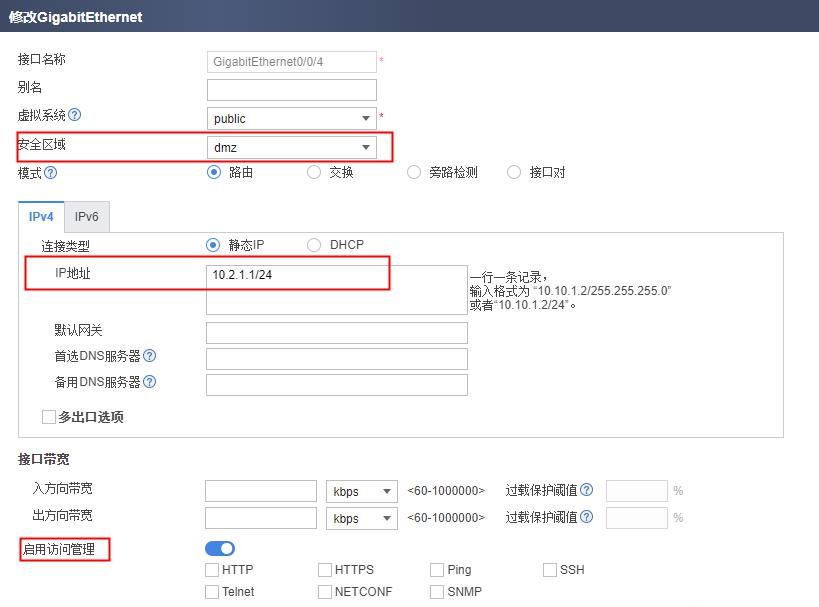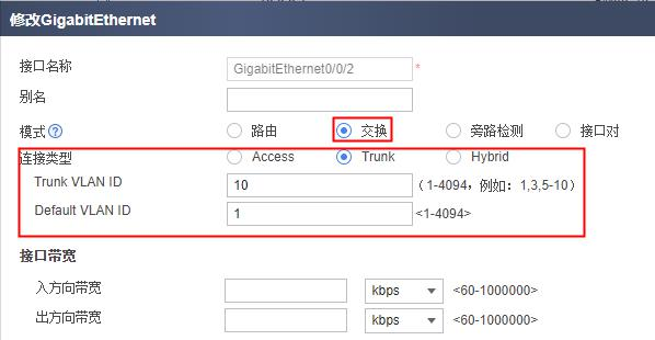 三层接入一般使用公网接口 IP 地址即可;二层透明接入则需要配置一个 VLANIF 接口,配置接口 IP 并加入安全区域,具体步骤参见二层透明接入后续处理。
