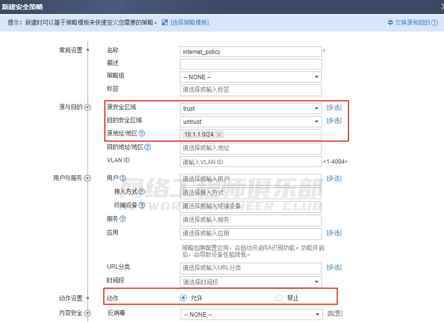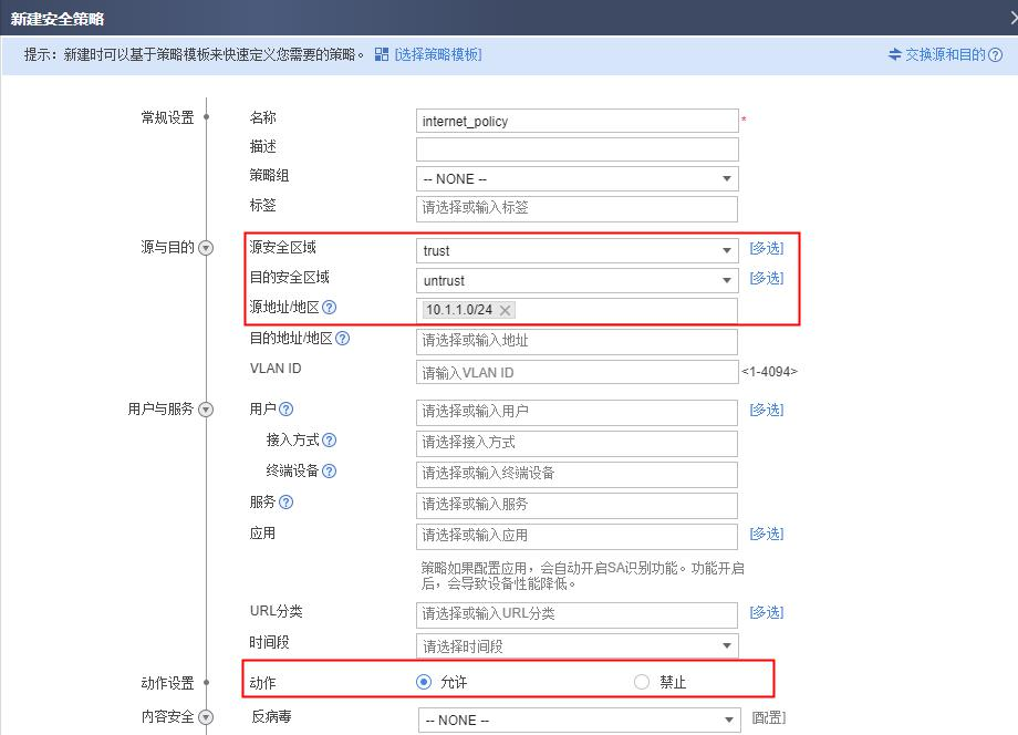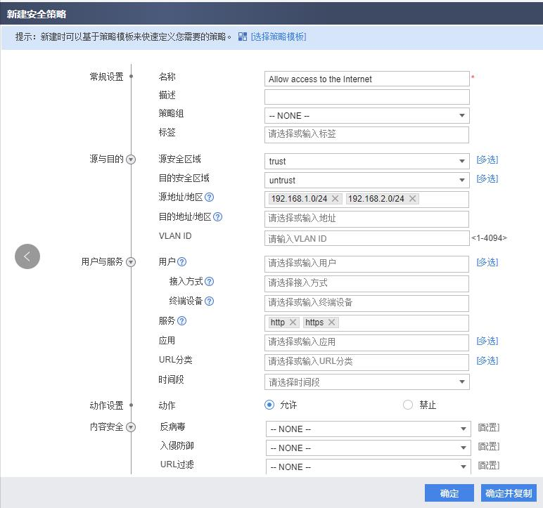 2. 配置基础安全策略允许内网用户访问 Internet。
