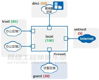 防火墙的安全区域按照安全级别的不同从 1 到 100 划分安全级别,数字越大表示安全级别越高。