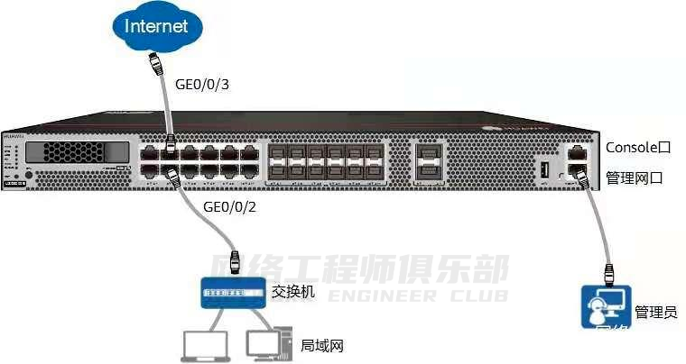 按下图连接管理网口、内网口 GE0/0/2 和外网口 GE0/0/3。