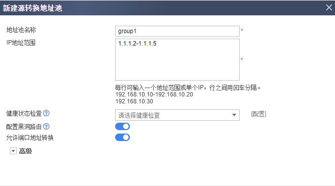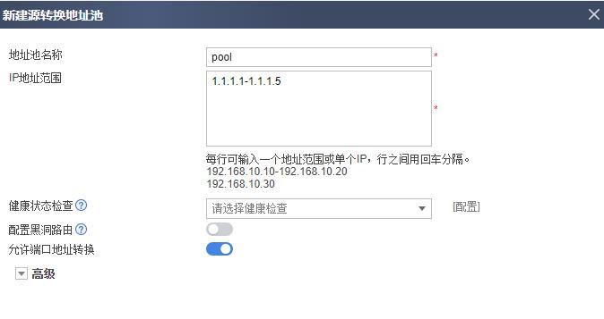 b. 选择“源转换地址池”页签,新建地址池,地址池中是可供使用的公网 IP 地址范围。