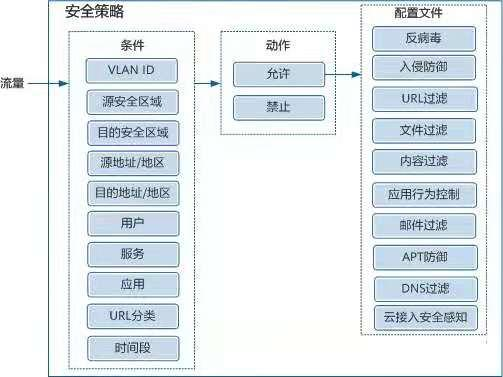 如图 1-4 所示,安全策略由匹配条件、动作和内容安全配置文件组成,针对允许通过的流量可以进一步做反病毒、入侵防御等内容安全检测。