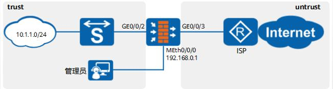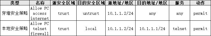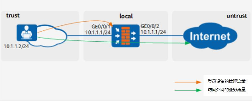 以上例子中,位于 trust域的 PC 登录防火墙,配置 trust 访问 local 的安全策略;