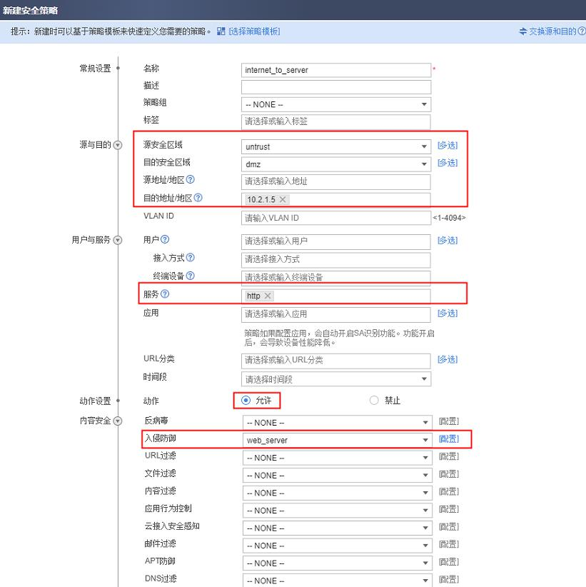 2. 配置允许外网用户访问内网的 Web 服务器 10.2.1.5,并引用缺省入侵防御配置文件对流量进行威胁检测。