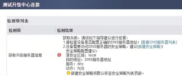 根据诊断信息进行故障处理。测试防火墙访问 Internet使用防火墙 Web 界面提供的升级中心(isecurity.huawei.com)连通性测试功能进行测试。