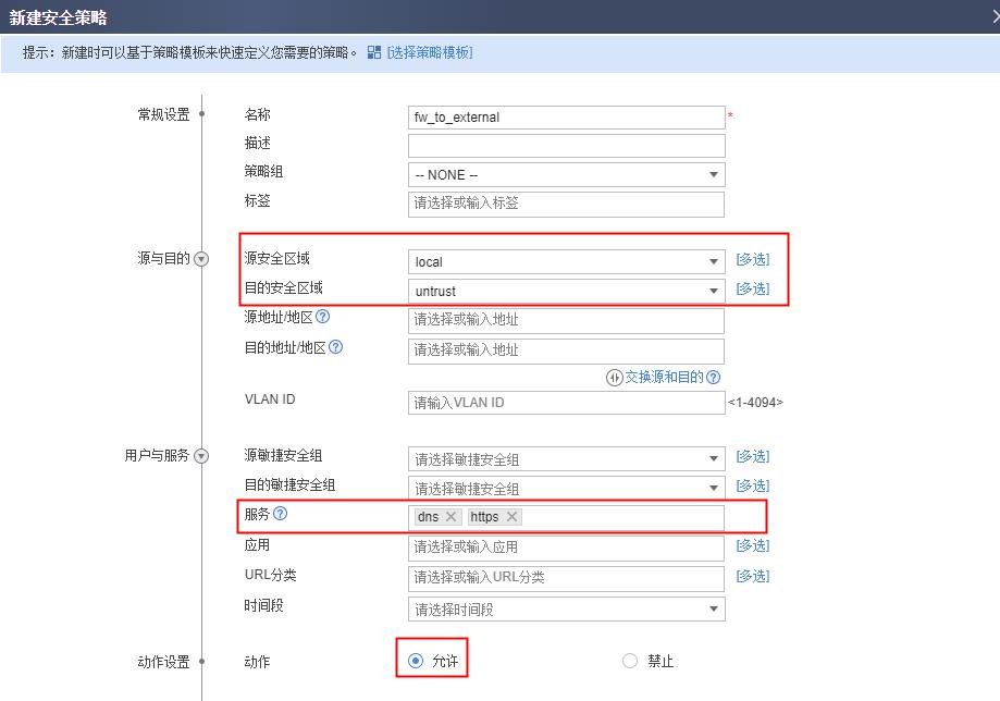 放行的服务等根据业务需求制定,例如防火墙访问 DNS 服务器要放行 DNS,防火墙升级特征库要放行 HTTPS。